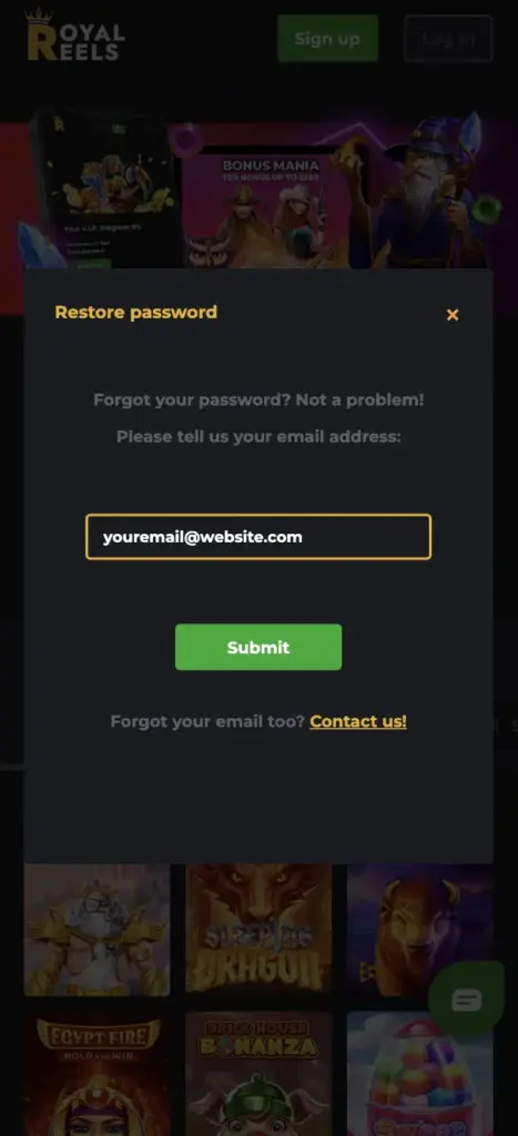 How can I restore access if I forgot my Royal Reels password?