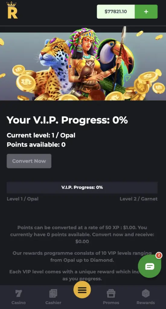 Weekly reload promotions operate Monday through Friday with percentages ranging from 25-40%. The Royal Cashback program returns 10% of weekly pokie losses to qualifying accounts. Requirements include three deposits of $30+ AUD and a recent deposit within 30 days. The VIP system accumulates experience points convertible to real funds through the Profile section. The RoyalReels online mobile app processes bonus conversions and cashback payments identically to desktop versions, without delays or reduced percentages.